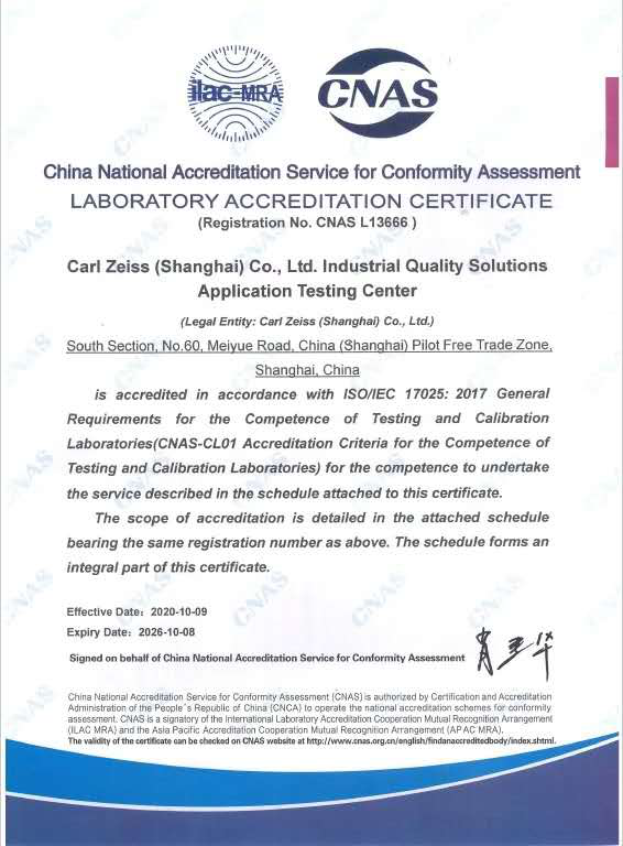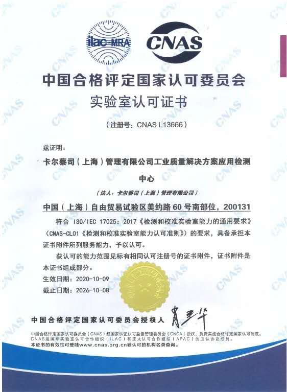 近日,卡尔舒兰蔡司(上海)管理有限公司工业质量解决方案应用检测中心经过中国合格评定国家认可委员会(CNAS)严格的现场评审和后续考察,正式通过了最终审评并获得实验室国家认可证书。至此,标志着蔡司应用检测中心具有了国家及国际认可的管理水平和校准能力。